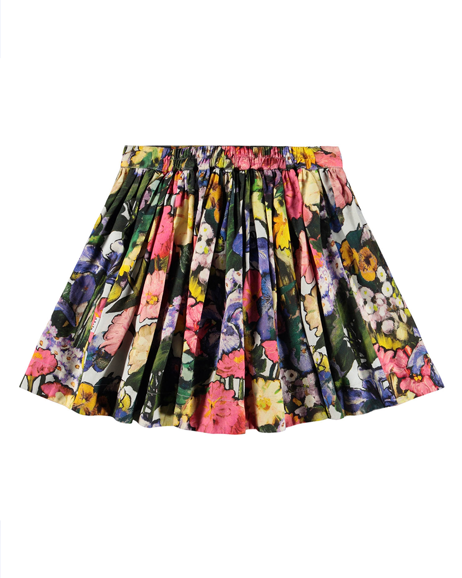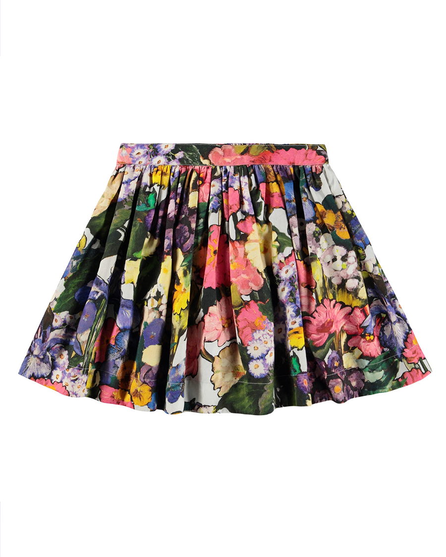 花柄プリントのコットンビスコース素材のカラフルなスカート。膝丈で、前側は固定されたウエストバンド、後ろ側は伸縮性のあるゴム仕様のため、着脱が簡単で快適な着用感です。